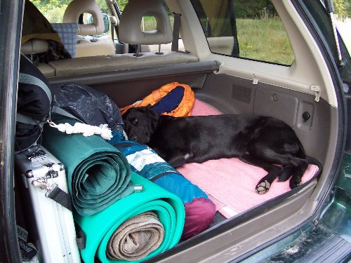 Auch Trosshunde sind nach 20 km durch die Eifel und Elz-Durchquerungen sehr müde! Draußen warten Disteln, daher lieber im Auto. "Hier kann mich auch keiner vergessen!"