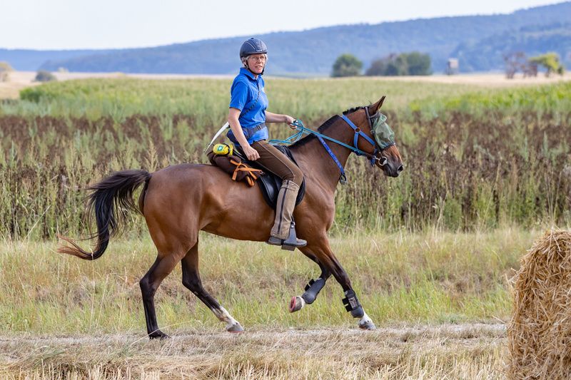 Reitenberg-Distanz - 31 km- 2:59 h, T 5,77 - hoch über dem Neckar. Schotter, trockener und harter Boden aber Sonne und Hitze! Ein toll organisierter Ritt und eine super zu reitende 2. Runde mit viel Wasser an der richtigen Stelle. Levana hat sich gut erholt und kam in Leistungsklasse 2. Die ausgiebige Wasserpause und ein bisschen warten auf den mit uns startenden Youngster hat ein paar Minuten zur LK 1 gekostet. Die Pferde stört es nicht!