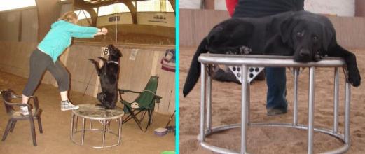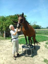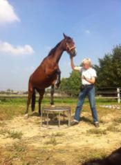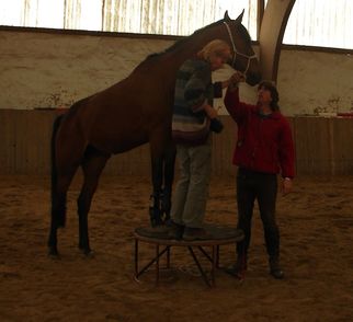 Ende Mai fand der "Zirkuskurs" bei Uwe Jourdain statt. Manche Vereinsmitglieder finden wohl, wir machen uns zum Affen. Aber unsere Pferde zeigten es uns! Penthi lernte innerhalb von 1 Tag den freien Seitwärtsgang - für mich bisher ein Hexenwerk und nun können wir schon an der Feinabstimmung arbeiten. Das "Tanzen" gefällt ihr so gut, dass sie sich weiterdreht, auch wenn die Leckerlis alle sind. Obwohl das Podest nach einmaligem Gebrauch lange nur von Weitem angeschaut wurde, bestieg Penthi es mit einer Selbstverständlichkeit, die mich erstaunte.