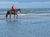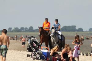 Mit einem Pferd ist es aber ganz einfach, vorsichtig an Decken, Burgen, Strandkörben und kleinen nassen Kindern zu reiten. Auch schön: eine 3 km lange Grasstrecke im flotten Galopp. Außerdem hatten wir eine tolle Tross-Truppe.