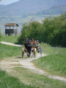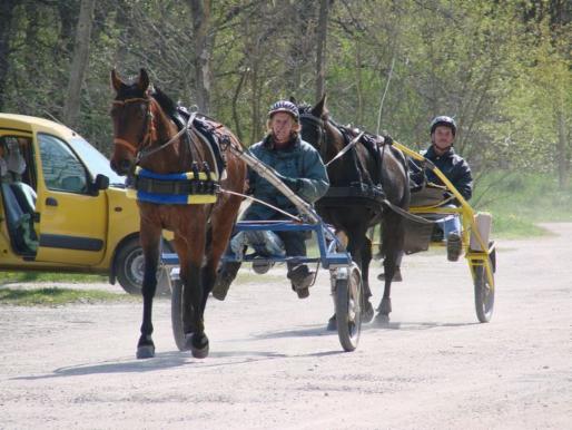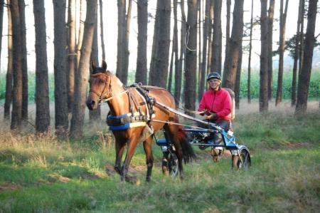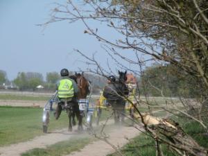 Training hört nie auf: Levana ist kandarenreif, Choco begleitet den Distanzeinsteiger-Lehrgang mit Penthi vor dem Sulky.