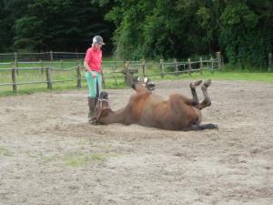 Im Schritt noch alles gut. Erstes Antraben: Rodeo! Wohlverdienstes Wälzen im Ziel. Mindestens 5 x hin und her.