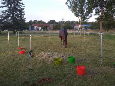 ... fängt spät an: 6. Juni Sand-Distanz, 35 km. Chocos Distanz-Einstand ist gut gelungen. Levana machte es Spaß, mit einer Stallkollegin zu starten. Das große Paddock gefiel beiden gut. In den grünen 10 l Wassereimer passen beiden Holsteinernasen gleichzeitig.