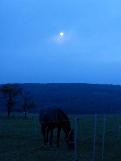 3. Eifel-Distanz 40-40 km. Levana muss auch wieder "ran" und meistert den 2-Tages-Ritt noch besser als letztes Jahr, auch wieder mit Alu-Eisen von Michael Zanger, die dieses Jahr sogar noch 1 Woche länger halten. Kirsten Kunkel hat die wunderbare Stimmung des Wochenendes mit dem großen Vollmond festgehalten: