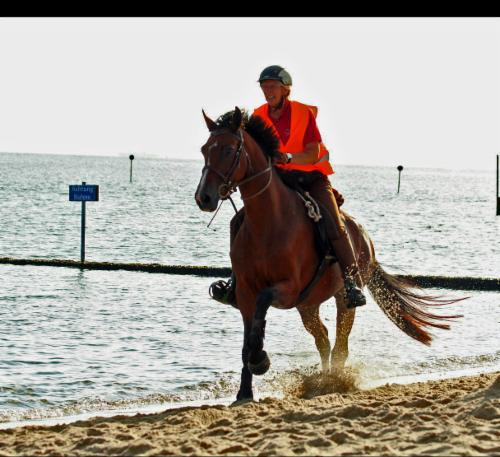 August: CJP Nordsee-Distanz Hooksiel, 64 km - 5. Platz mit einem Feldtest am Freitag mit 6,4 und einer Dressur hinter dem Deich von 6,0. Das Protokoll klingt sehr erfreulich, die Richterin hat alle Schwächen und Stärken genau erkannt. So macht es im Viereck Spaß. Die Geländestrecke am Samstag war spannend, vor allem am Strand bei über 20 °C und strahlendem Sonnenschein. Es war knackevoll.