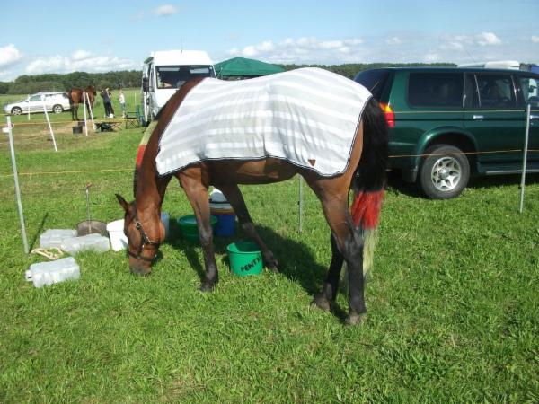 Auch 2009 konnten wir mit einem Sieg beginnen. Die Sponsoren Globetrotter und Masterhorse sowie Pfiff waren äußerst großzügig; so konnte Penthi mit ihrer ersten gewonnenen Decke von Pfiff nach Hause fahren, mit energiereichem Futter von Masterhorse die Reserven auffüllen und sich die übel verstochenen zarten Hautstellen mit MASTERHORSE-LEBERTRAN-ZINK-SALBE pflegen lassen. Die Schwellungen sind auch gut verheilt. Übeltäter waren die uns völlig unbekannten Hirschlausfliegen, die sich nicht erschlagen lassen, man muss sie schon teilen. Was wir leider nicht wussten: Sie verstecken sich in Hautfalten und reisen mit. Bis zum Pfingstmontag hat noch so ein Blutsauger zwischen Penthis Hinterbeinen überlebt. Auch Hirschlausfliegen werden uns 2010 nicht von den schönen Ritten abhalten!